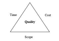 Consider briefly the diagram below, referred to as the Project Management Triangle. Each side represents a core component of a project. By varying any of the components of the project the others need to be adjusted to maintain quality.