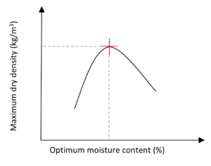 The Proctor value is the maximum dry density of the soil along with the optimum moisture content required to achieve this value as determined from laboratory testing. By systematically increasing the moisture content of the soil under controlled lab compaction and assessing its density we are able to obtain this value. The Proctor value varies for different materials and for different sizes of materials. For example a clay type soil which has very small particles will have a different Proctor value than a limestone crusher run. Basically if you start with a dry sample of soil, of known mass and add moisture to it, the soil will tend to bind together when mixed with water and compacted, that is unless the soil is free-draining. As you increase the moisture, the soil particles are expected to bind closer together to compact further. However we reach a point of maximum density whereby the further addition of water, instead of binding the particles, serves to do the opposite and actually decreases the density. When plotted on a graph of density vs. moisture content we get the Proctor curve for the soil. See Figure 2 for an example of a Proctor curve of a soil.