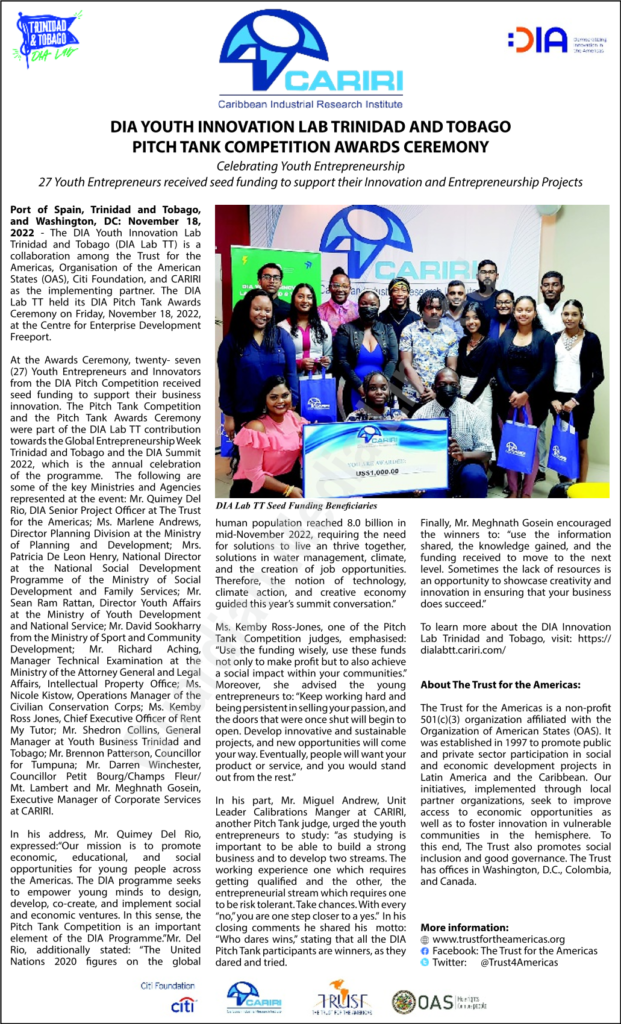 Port of Spain, Trinidad and Tobago, and Washington, DC: November 18, 2022 – The DIA Youth Innovation Lab Trinidad and Tobago (DIA Lab TT) is a collaboration among the Trust for the Americas, Organisation of the American States (OAS), Citi Foundation, and CARIRI as the implementing partner. The DIA Lab TT held its DIA Pitch Tank Awards Ceremony on Friday, November 18, 2022, at the Centre for Enterprise Development Freeport.