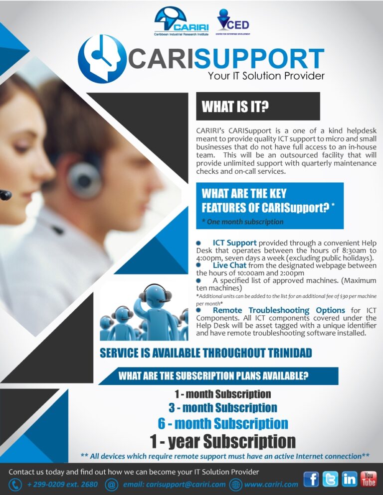 On Thursday 7th July 2016, the Caribbean Industrial Research Institute (CARIRI) launched a new initiative, an Information and Communication Technology (ICT) Help Desk for Micro Small and Medium-Sized Enterprises (MSMEs) called CARISupport.